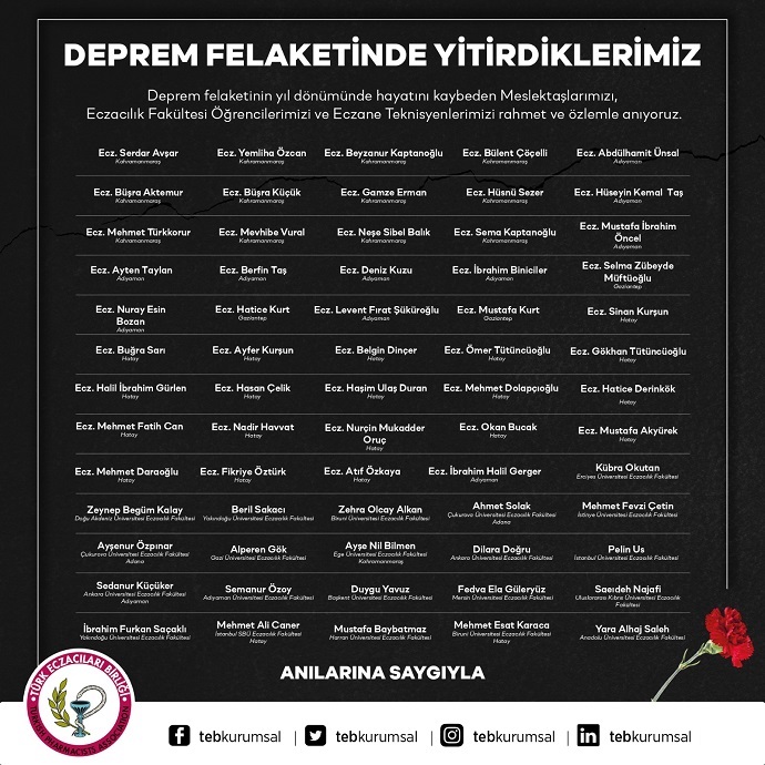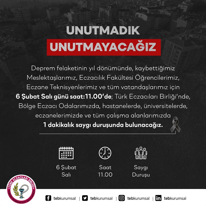 Deprem felaketinin yıl dönümünde, kaybettiğimiz Meslektaşlarımız, Eczacılık Fakültesi Öğrencilerimiz, Eczane Teknisyenlerimiz ve tüm vatandaşlarımız için 6 Şubat Salı günü saat:11.00’de; Türk Eczacıları Birliği’nde, Bölge Eczacı Odalarımızda, hastanelerde, üniversitelerde, eczanelerimizde ve tüm çalışma alanlarımızda 1 dakikalık saygı duruşunda bulunacağız.